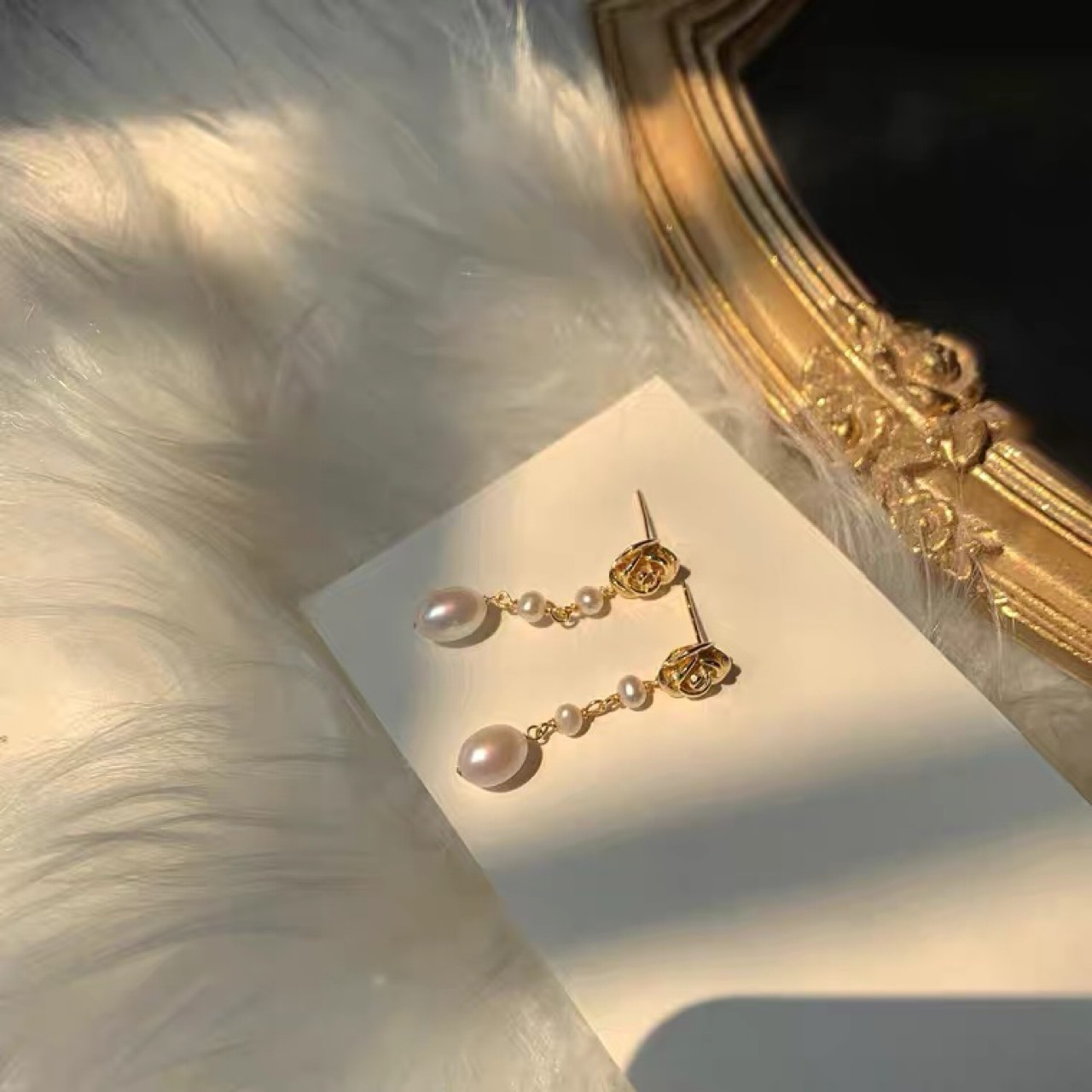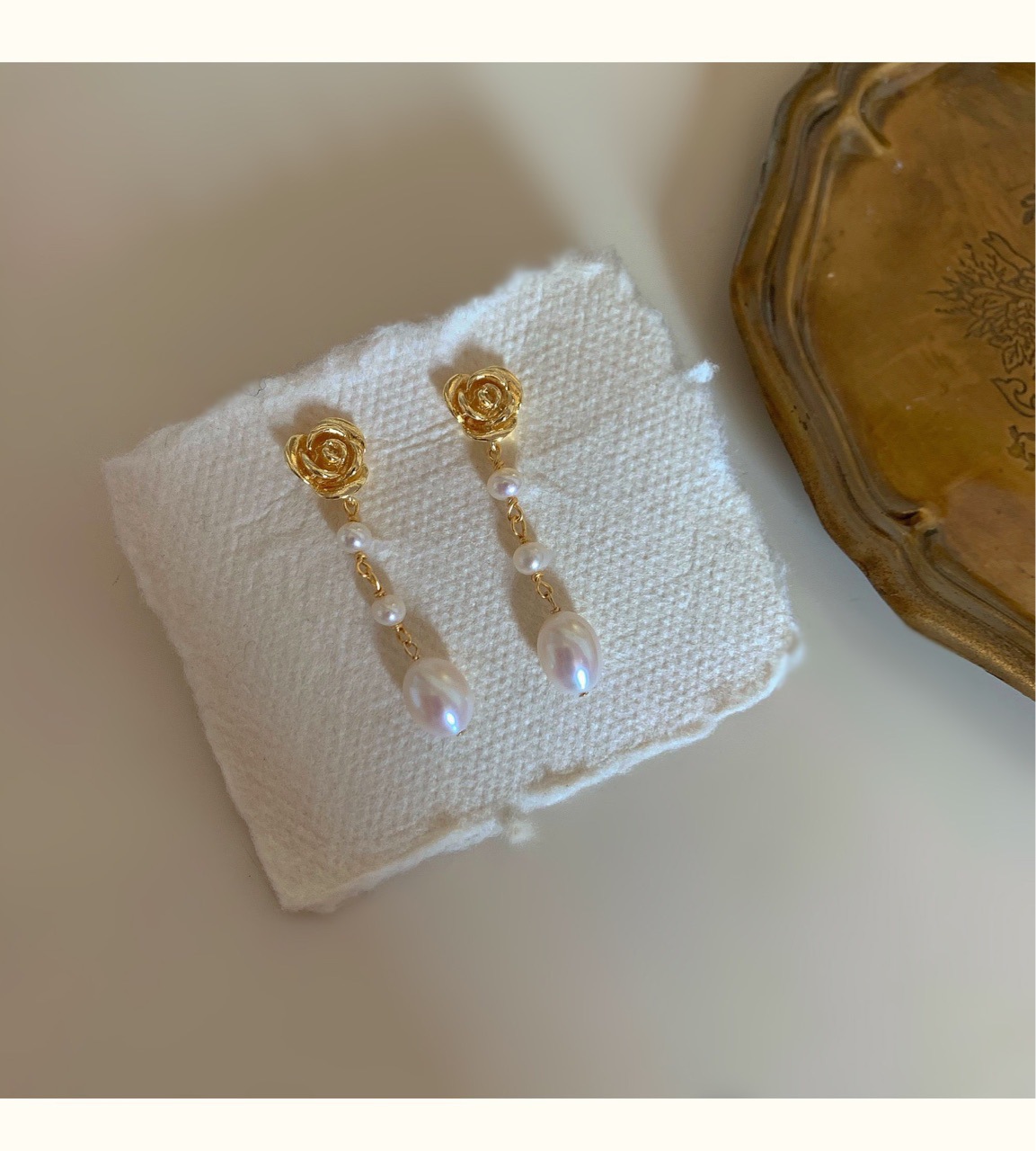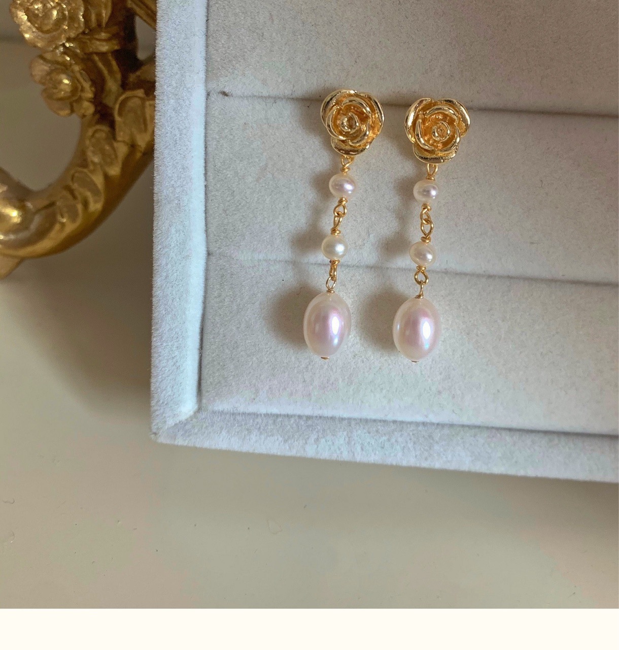 复古立体玫瑰天然强光珍珠耳钉简约冷淡风耳饰2022年新款银镀金