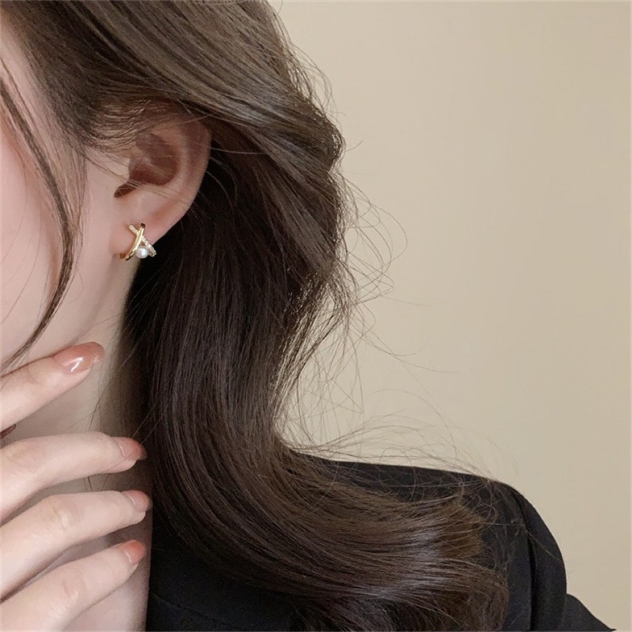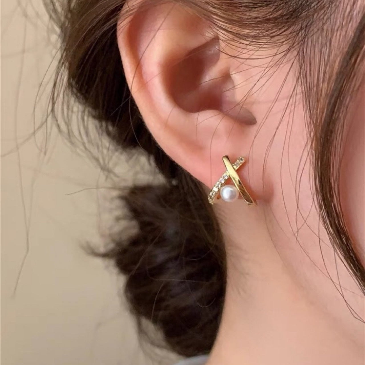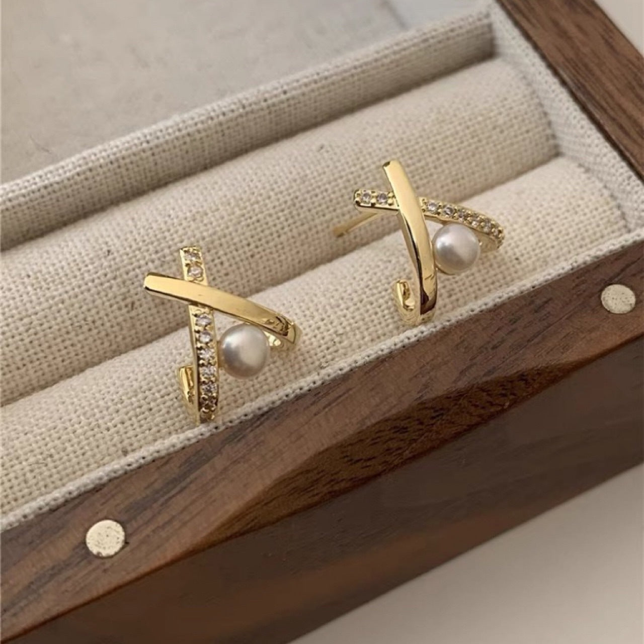 微镶锆石交叉天然淡水珍珠耳钉感s925银针气质百搭小巧女