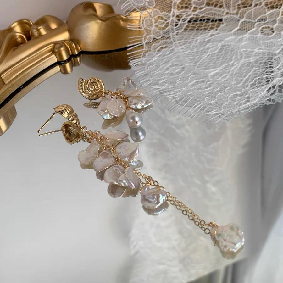 keshi碎银天然巴洛克花瓣珍珠贝壳海螺925银针法式浪漫小众耳环新
