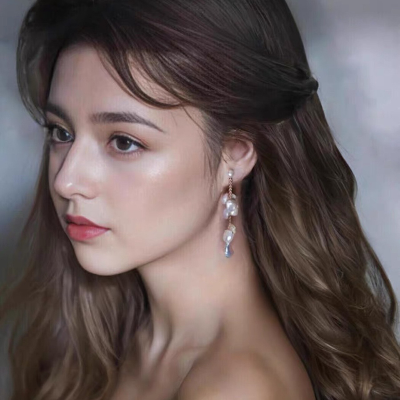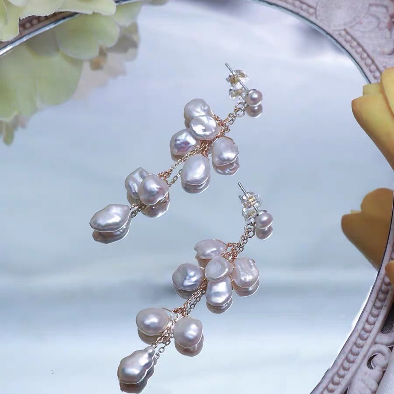 keshi长款设计显脸小天然淡水异形花瓣珍珠碎银子长流苏耳环耳饰